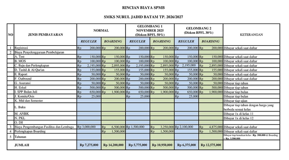 5. Pembayaran yang dilakukan melalui transfer diharapkan melampirkan bukti transfer pada saat registrasi akademik di sekretariat SMK Nurul Jadid Batam dengan mencantumkan nama pengirim dan nama siswa/i yang telah dinyatakan lulus pada ujian saringan masuk (Contact Person : 0813-9932-3351)